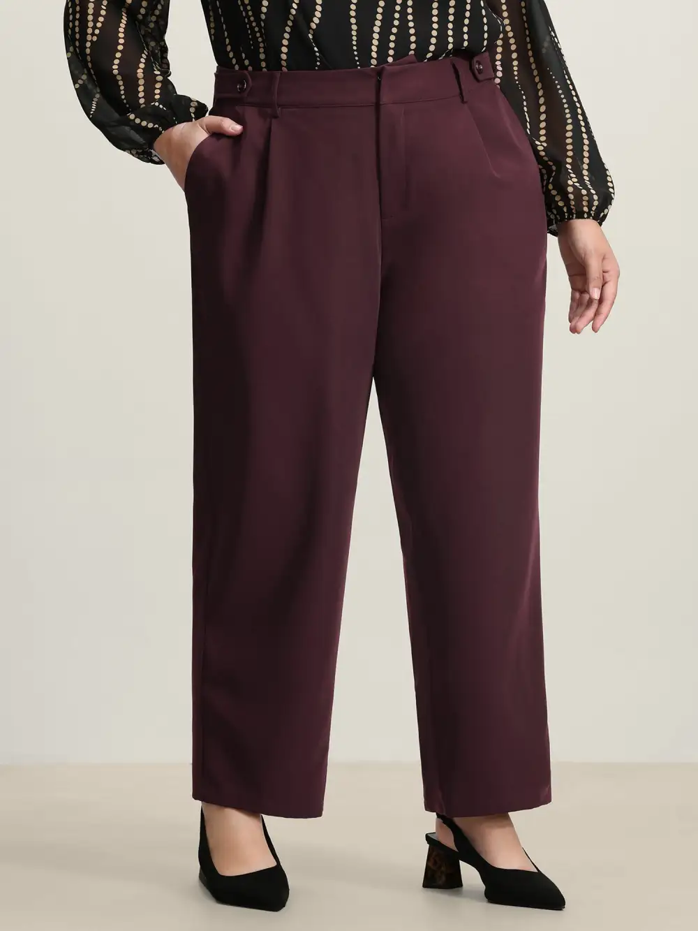 Shop Adjustable Waist Straight-Leg Pants now and redefine your style with confidence at BloomChic. Tailored for mid and plus-size women. This trendy Bottoms Women, sizes 10-30. Color:Plum;Waist Design:Mid Rise;Prints:Non;Details:Pleated;Pocket:Slanted pocket;Belt:No-belt;Closure Type:Non