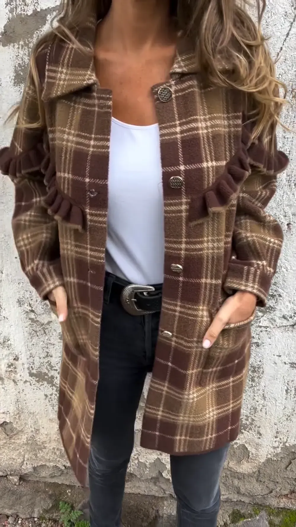 The standout detail of this piece is the playful ruffled accents that run along the sleeves, adding a touch of elegance and uniqueness to a traditional design. The coat's vintage-inspired buttons, combined with its structured collar, give it a polished and refined look. With deep pockets for convenience and a tailored fit, this coat pairs effortlessly with casual jeans or layered over a dress for an elevated outfit.