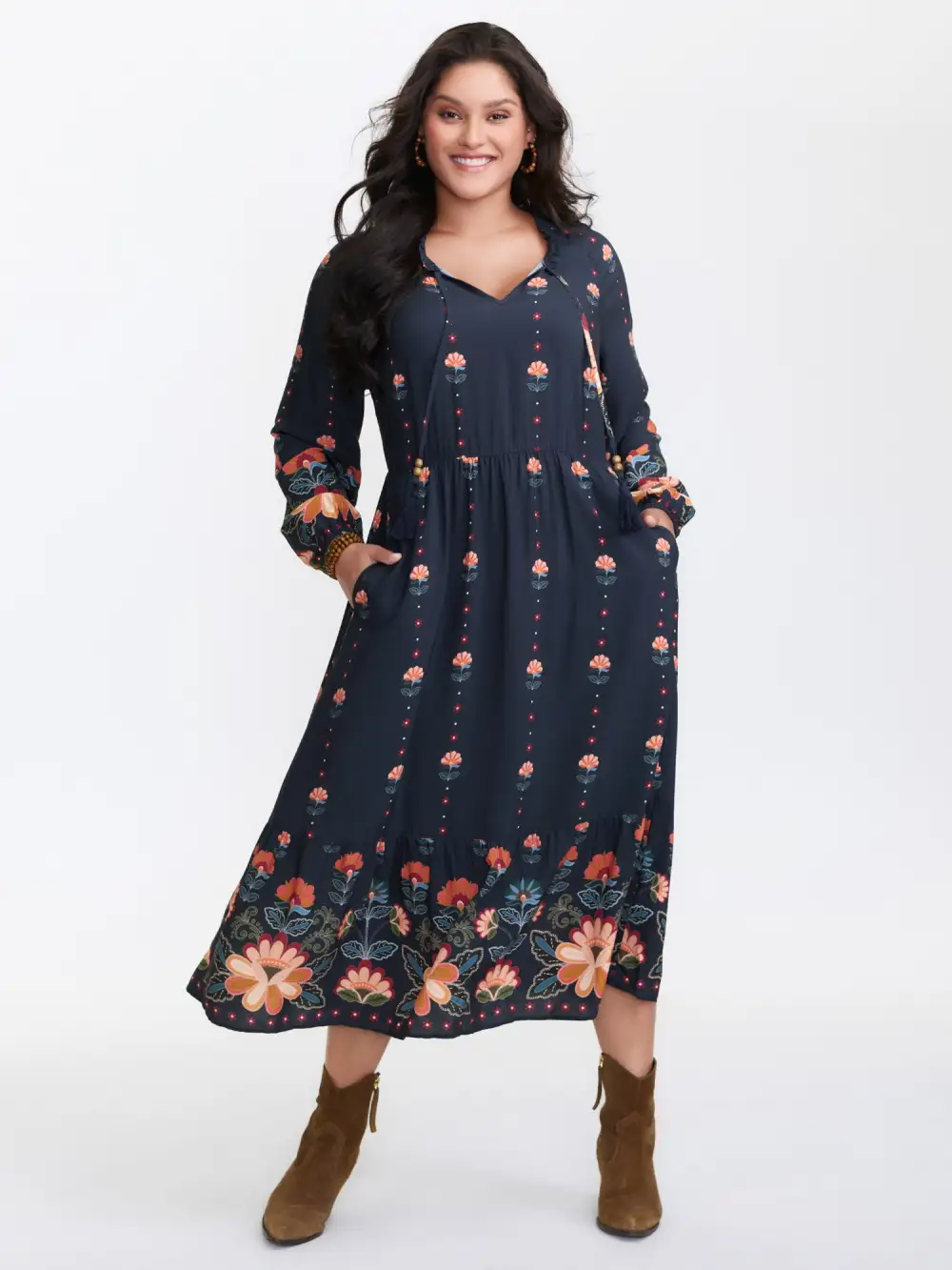 Shop Boho Print Neck Tie Maxi Dress now and redefine your style with confidence at BloomChic. Tailored for mid and plus-size women. This trendy Dress, sizes 10-30. You can never go wrong with BloomChic Dresses. Color:DarkBlue;Neckline:Flat collar with V-notch;Sleeve Type:Lantern Sleeve;Prints:Bohemian print;Pocket:Side seam pocket;Belt:No-belt;Closure Type:Non