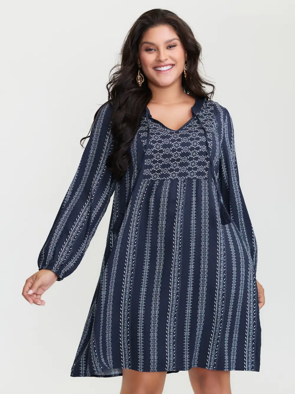 Shop Boho Stripe Notched Collar Ties Midi Dress now and redefine your style with confidence at BloomChic. Tailored for mid and plus-size women. This trendy Dress, sizes 10-30. You can never go wrong with BloomChic Dresses. Color:DarkBlue;Neckline:Flat collar with V-notch;Sleeve Type:Elastic cuff;Prints:Bohemian print;Pocket:Side seam pocket;Belt:No-belt;Closure Type:Half-open front