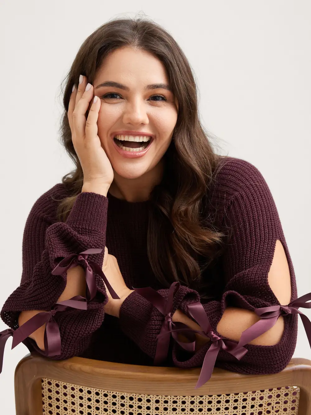 Shop Bowknot Cut-Out Sleeve Solid Pullover now and redefine your style with confidence at BloomChic. Tailored for mid and plus-size women. This trendy Sweaters Cardigans Women, sizes 10-30. Color:Plum;Style:Casual Everyday-Casual;Neckline:Round Neck;Sleeve Type:Lantern Sleeve;Prints:Non;Details:Cut-Out, Bowknot, Texture;Pocket:No-pocket;Belt:No-belt;Closure Type:Non