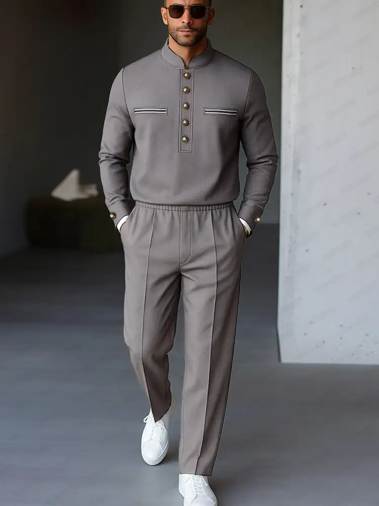 • Top:Long sleeve, button closure, stand collar, fake chest pockets