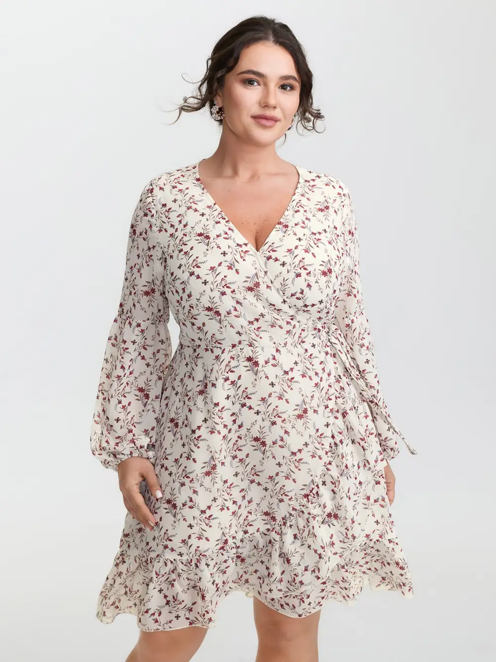 Shop Chiffon Floral Wrap Ruffled Mini Dress now and redefine your style with confidence at BloomChic. Tailored for mid and plus-size women. This trendy Dress, sizes 10-30. You can never go wrong with BloomChic Dresses. Color:Ivory;Neckline:Overlap Collar;Sleeve Type:Lantern Sleeve;Prints:Ditsy floral;Details:Overlapping;Pocket:Side seam pocket;Belt:No-belt;Closure Type:Non