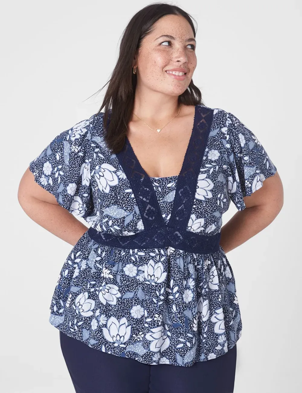 A babydoll top with ethereal lace trim and airy fabric. With the modesty panel, it's a completely layered look in one, just add your fave jeans!