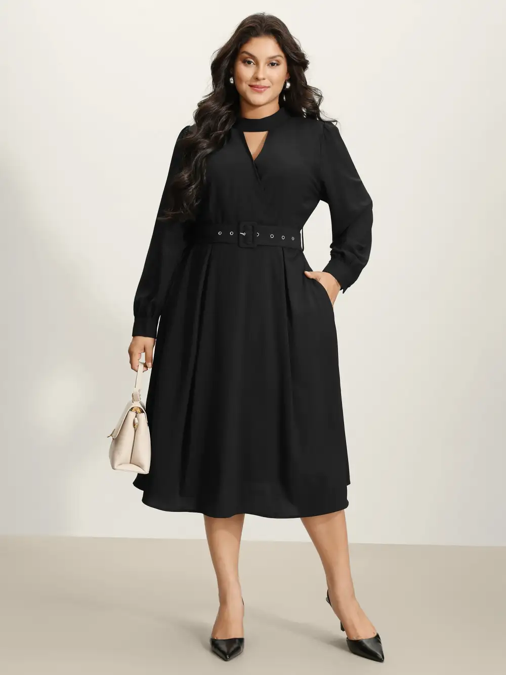 Shop Collar Cut-Out Waist Tie Midi Dress now and redefine your style with confidence at BloomChic. Tailored for mid and plus-size women. This trendy Dress, sizes 10-30. You can never go wrong with BloomChic Dresses. Color:Black;Neckline:V-neck;Sleeve Type:Gathered cuff;Prints:Non;Pocket:Side seam pocket;Belt:Belt;Closure Type:Non