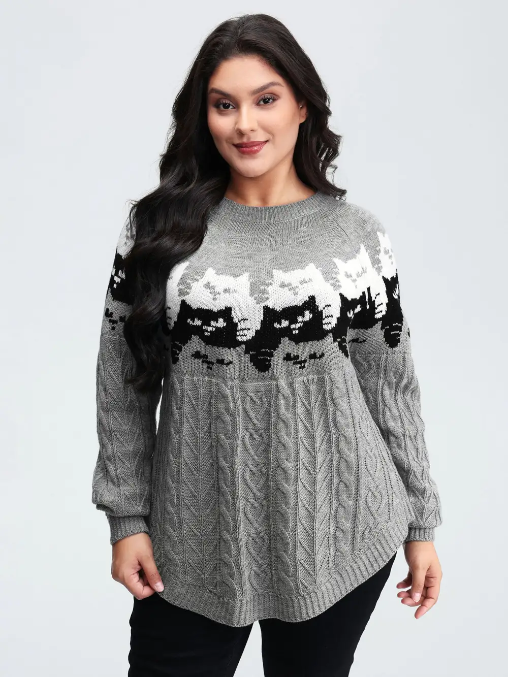 Shop Color Block Cat Pattern Arc Hem Pullover now and redefine your style with confidence at BloomChic. Tailored for mid and plus-size women. This trendy Sweaters Cardigans Women, sizes 10-30. Color:DarkGray;Style:Casual;Neckline:Round Neck;Sleeve Type:Raglan sleeve;Pattern Type:Animals;Prints:Non;Details:Texture;Pocket:No-pocket;Belt:No-belt;Closure Type:Non