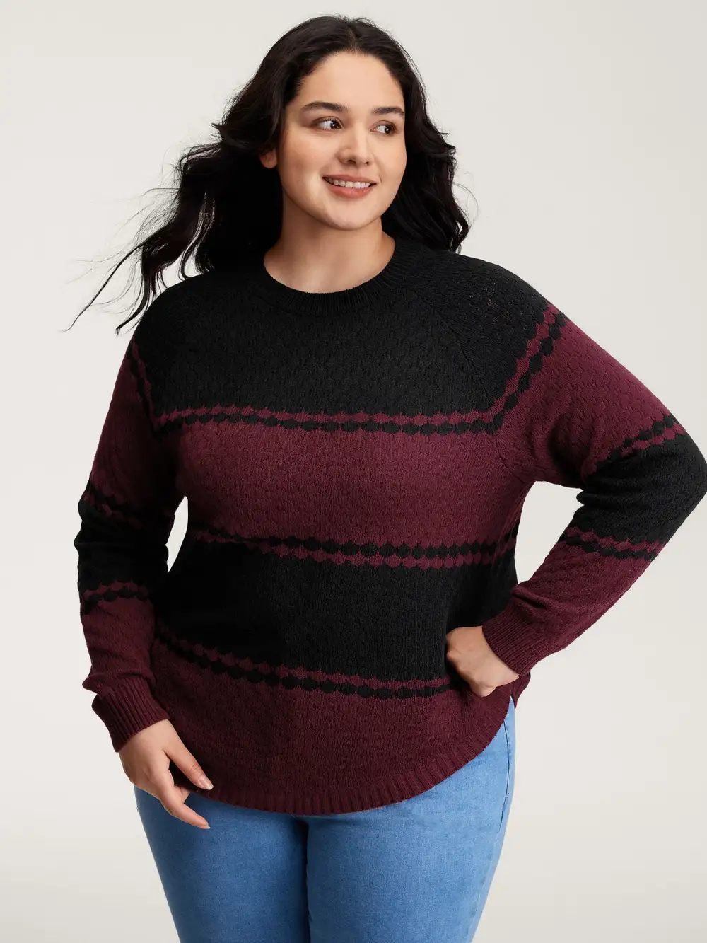 Shop Colorblock Curvy Hem Textured Pullover now and redefine your style with confidence at BloomChic. Tailored for mid and plus-size women. This trendy Sweaters Cardigans Women, sizes 10-30. Color:Plum;Neckline:Round Neck;Sleeve Type:Drop shoulder sleeve;Prints:Geometric & color block;Details:Texture, Contrast;Pocket:No-pocket;Belt:No-belt;Closure Type:Non