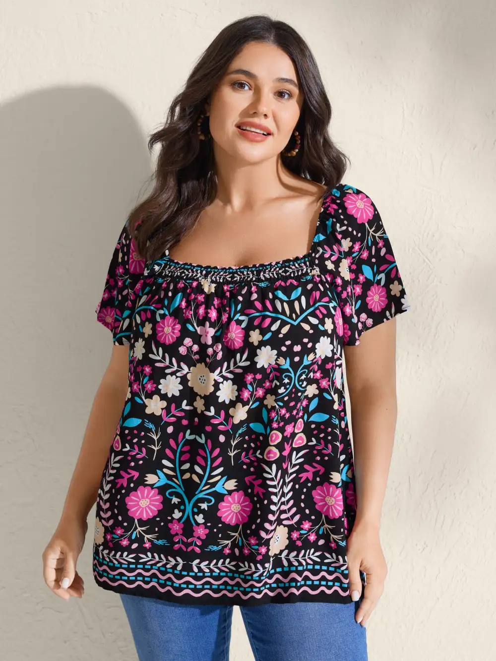 Shop Colorful Floral Print Shirred Neck Blouse now and redefine your style with confidence at BloomChic. Tailored for mid and plus-size women. This trendy Tops Women, sizes 10-30. Color:Black;Prints:Floral;Neckline:Square Neck;Sleeve Type:Raglan sleeve;Details:Shirred;Pocket:No-pocket