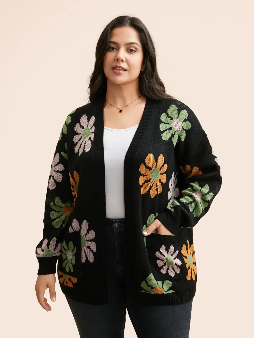 Shop Contrast Floral Patch Pocket Cardigan now and redefine your style with confidence at BloomChic. Tailored for mid and plus-size women. This trendy Sweaters Cardigans Women, sizes 10-30. Season:Winter;Color:Black;Style:Casual;Neckline:Kimono collar;Sleeve Type:Drop shoulder sleeve;Pattern Type:Natural Flowers;Prints:Floral;Pocket:Patch pocket;Belt:No-belt;Closure Type:Open front without closure