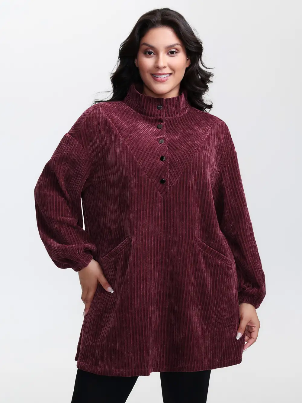 Shop Corduroy-Feel Pockets Stretchy Cuffs Sweatshirt now and redefine your style with confidence at BloomChic. Tailored for mid and plus-size women. This trendy Tops Women, sizes 10-30. Color:Plum;Neckline:Stand-up collar;Sleeve Type:Elastic cuff;Prints:Non;Pocket:Single-flap pocket;Belt:No-belt;Closure Type:Non