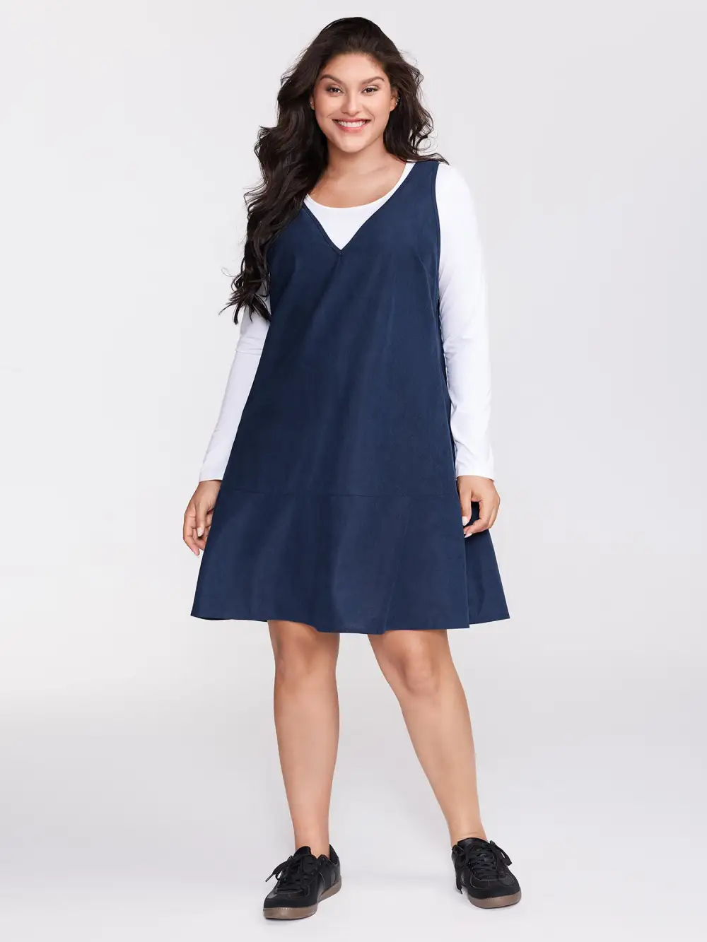Shop Corduroy Overall A-Line Adjustable Mini Dress now and redefine your style with confidence at BloomChic. Tailored for mid and plus-size women. This trendy Dress, sizes 10-30. You can never go wrong with BloomChic Dresses. Color:Indigo;Neckline:V-neck;Sleeve Type:Sleeveless;Prints:Non;Pocket:Side seam pocket;Belt:No-belt;Closure Type:Non