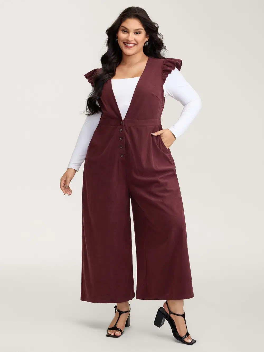 Shop Corduroy Stretchy Waist Flutter Sleeve Jumpsuit now and redefine your style with confidence at BloomChic. Tailored for mid and plus-size women. This trendy Jumpsuits Women, sizes 10-30. Color:Burgundy;Neckline:Non;Sleeve Type:Sleeveless;Prints:Non;Details:Button, Ruffles, Gathered, Tie knot, Backless, Texture;Pocket:Slanted pocket;Belt:No-belt;Closure Type:Decorative button