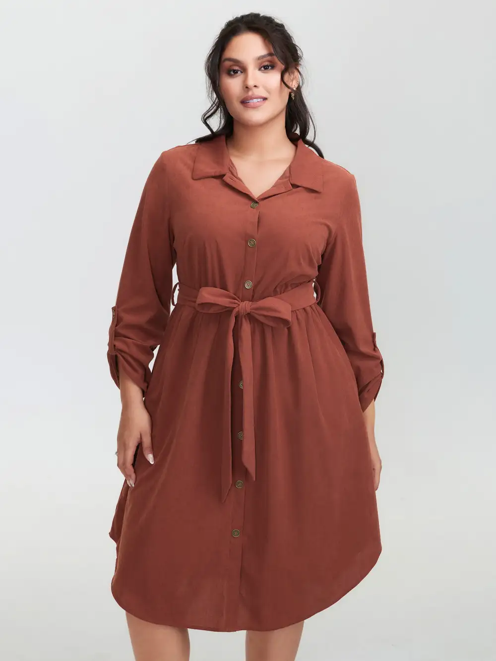 Shop Corduroy Tab Sleeve Belted Midi Dress now and redefine your style with confidence at BloomChic. Tailored for mid and plus-size women. This trendy Dress, sizes 10-30. You can never go wrong with BloomChic Dresses. Color:Rust;Neckline:Shirt collar;Sleeve Type:Button cuff sleeve;Prints:Non;Details:Button, Belted;Pocket:Side seam pocket;Belt:Belt;Closure Type:Button