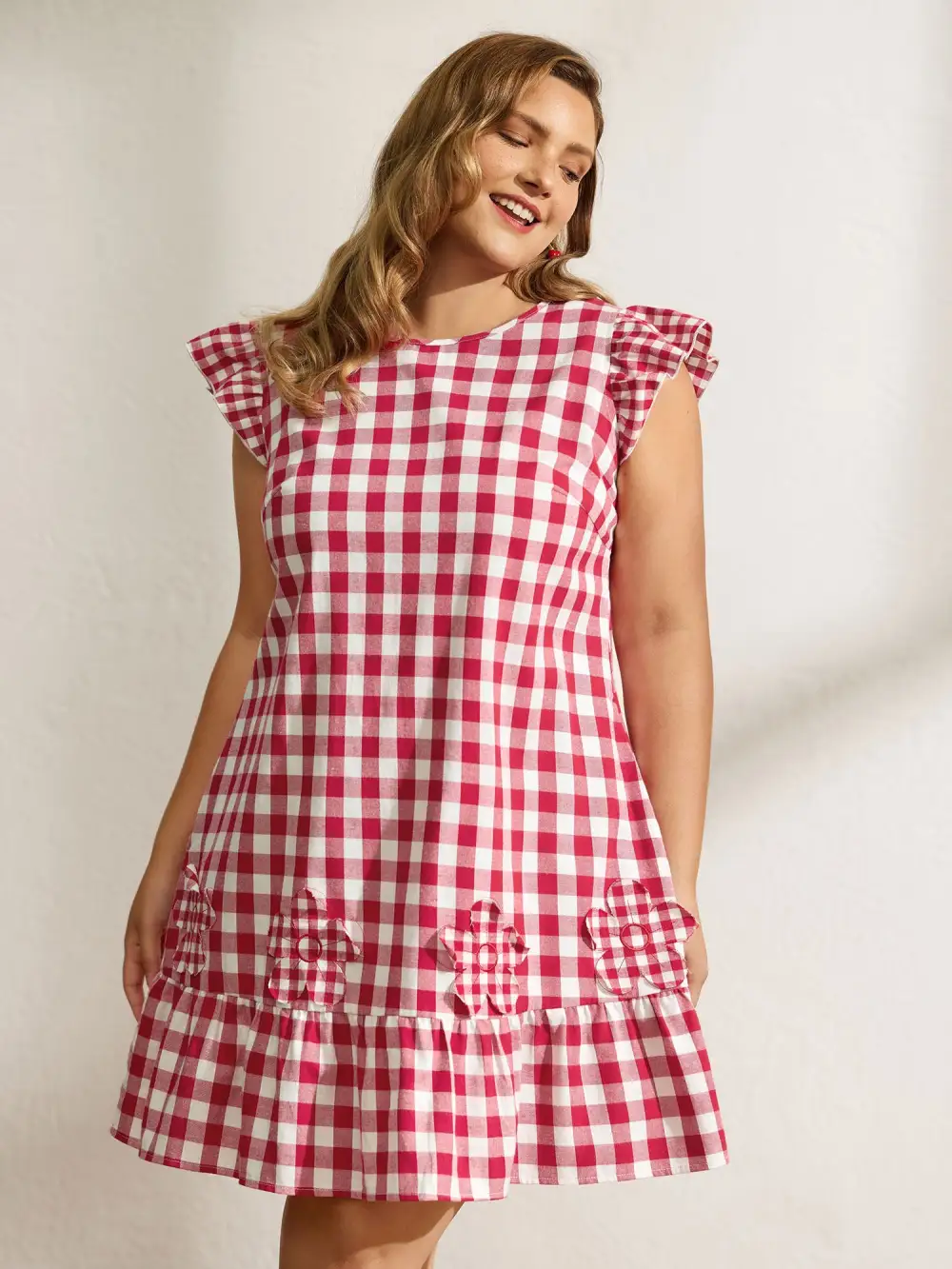 Shop Cotton Gingham Embroidered Ruffled Hem Knee Dress now and redefine your style with confidence at BloomChic. Tailored for mid and plus-size women. This trendy Dress, sizes 10-30. You can never go wrong with BloomChic Dresses. Color:Brightred;Neckline:Round Neck;Sleeve Type:Cap sleeve;Prints:Plaid;Details:Ruffles, Embroidered;Pocket:Side seam pocket;Belt:No-belt;Closure Type:Non