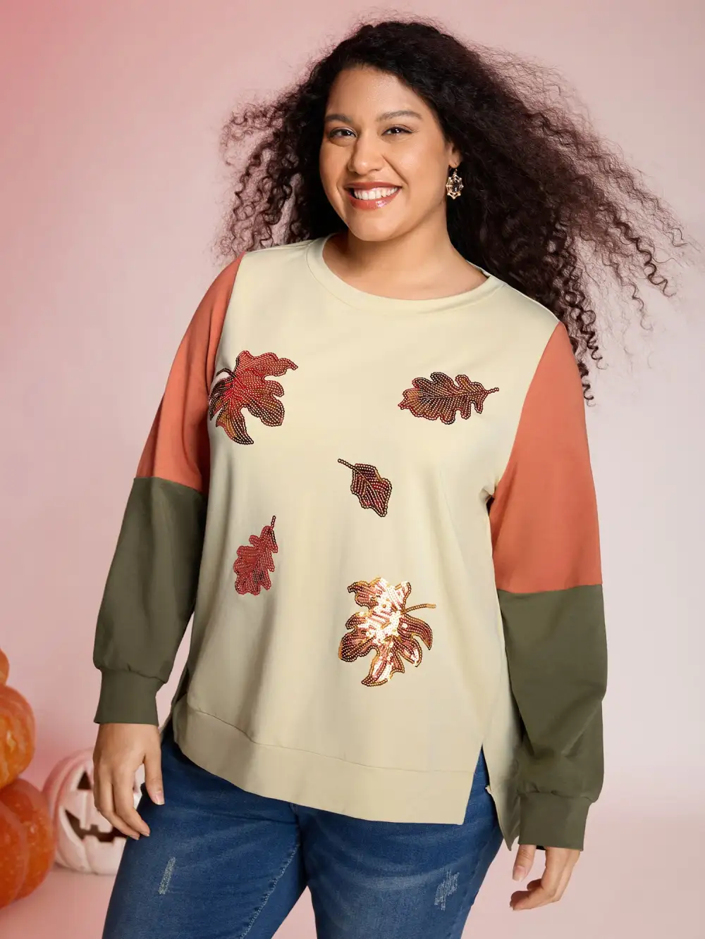 Shop Crisp Leaf Print Sequin Embroidery Sweatshirt now and redefine your style with confidence at BloomChic. Tailored for mid and plus-size women. This trendy Tops Women, sizes 10-30. Color:Beige;Neckline:Round Neck;Sleeve Type:Gathered cuff;Prints:Tropical;Pocket:No-pocket;Belt:No-belt;Closure Type:Non