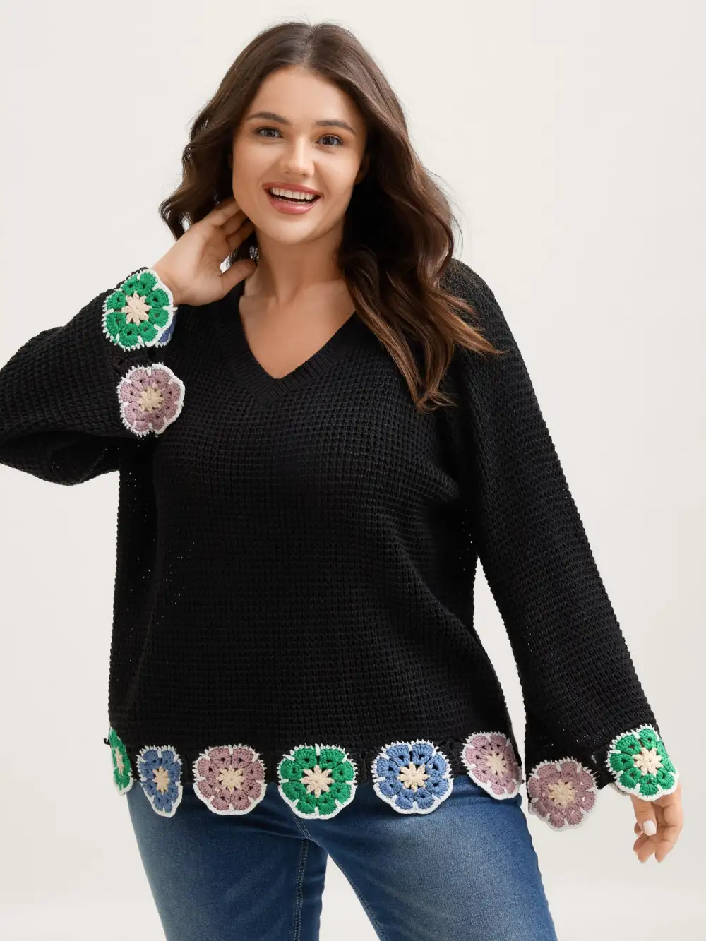 Shop Crochet Floral Hem V-Neck Pullover now and redefine your style with confidence at BloomChic. Tailored for mid and plus-size women. This trendy Sweaters Cardigans Women, sizes 10-30. Color:Black;Style:Casual;Neckline:V-neck;Sleeve Type:Bell Sleeve;Pattern Type:Natural Flowers;Prints:Floral;Details:Crochet, Texture;Pocket:No-pocket;Belt:No-belt;Closure Type:Non