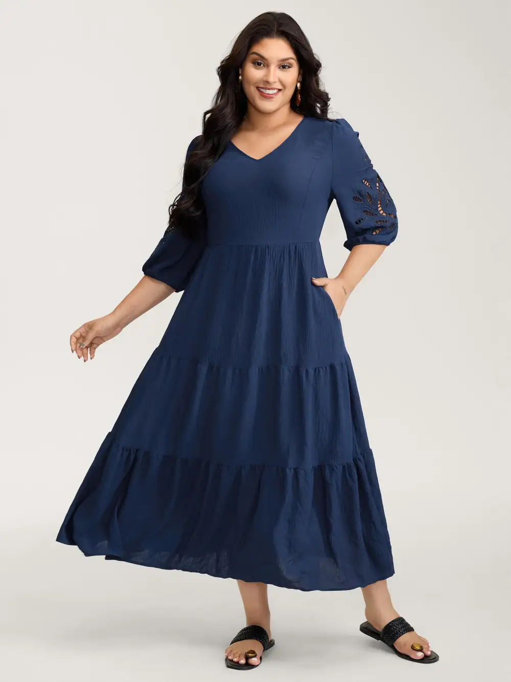 Shop Floral Cut-Out Embroidery Tiered Maxi Dress now and redefine your style with confidence at BloomChic. Tailored for mid and plus-size women. This trendy Dress, sizes 10-30. You can never go wrong with BloomChic Dresses. Color:Indigo;Neckline:V-neck;Sleeve Type:Lantern Sleeve;Prints:Non;Details:Broderie anglaise, Gathered;Pocket:Side seam pocket;Belt:No-belt;Closure Type:Non