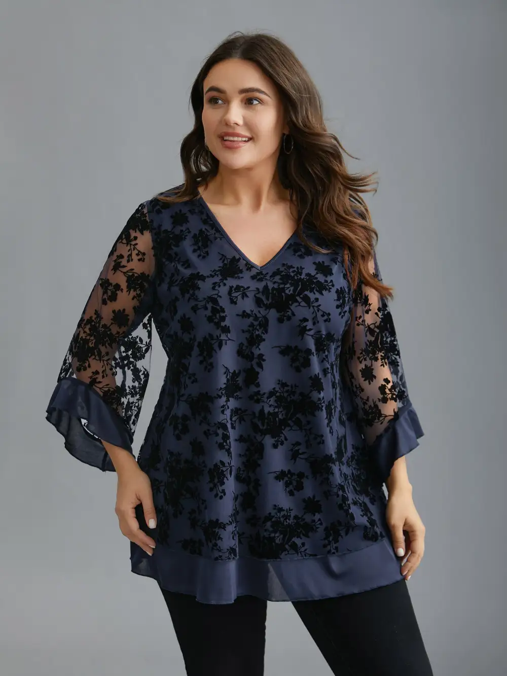 Shop Floral Flocking Mesh Asymmetrical Hem Blouse now and redefine your style with confidence at BloomChic. Tailored for mid and plus-size women. This trendy Tops Women, sizes 10-30. Color:Indigo;Style:Elegant;Prints:Non;Neckline:V-neck;Sleeve Type:Bell Sleeve;Details:Patchwork, Contrast, See through;Pocket:No-pocket