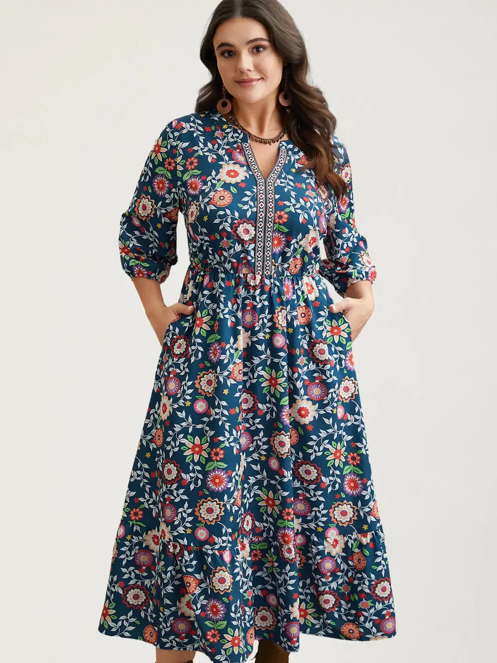 Shop Floral Print Stretchy-Waist Pockets Maxi Dress now and redefine your style with confidence at BloomChic. Tailored for mid and plus-size women. This trendy Dress, sizes 10-30. You can never go wrong with BloomChic Dresses. Color:Navy;Style:Resort;Neckline:Flat collar with V-notch;Sleeve Type:Elastic cuff;Prints:Bohemian print;Details:Non;Pocket:Side seam pocket;Belt:No-belt;Closure Type:Non;Structural function:waist defined,Cinched & Flared,arm coverage,Elongate neckline,Compatible,Elastic Waistband