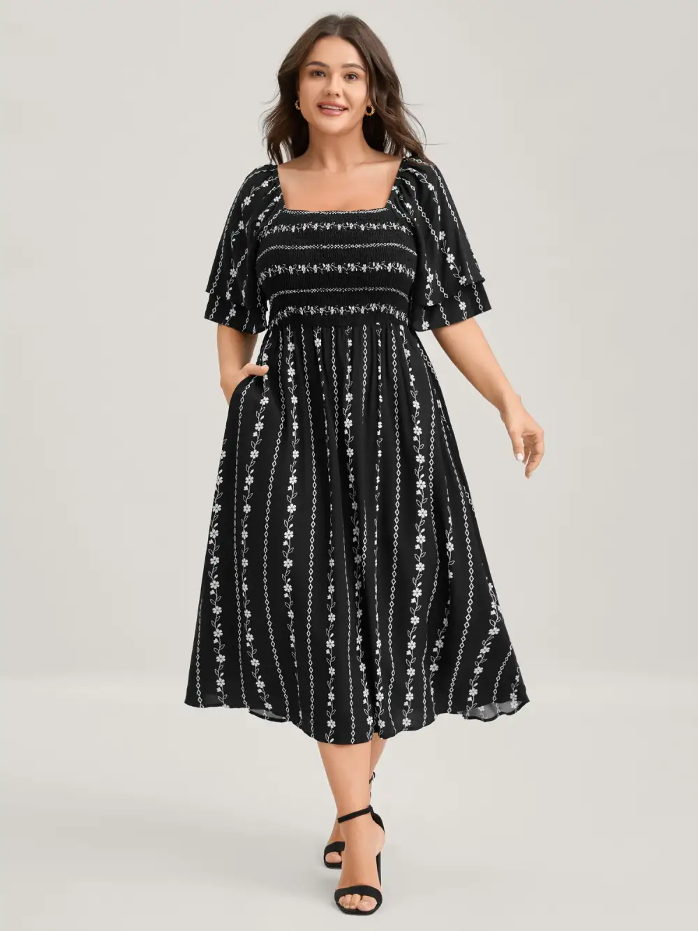 Shop Floral Stripes Layered Ruffle Sleeve Midi Dress now and redefine your style with confidence at BloomChic. Tailored for mid and plus-size women. This trendy Dress, sizes 10-30. You can never go wrong with BloomChic Dresses. Color:Black;Neckline:Square Neck;Sleeve Type:Ruffle Sleeve;Prints:Bohemian print;Details:Ruffles, Shirred;Pocket:Side seam pocket;Belt:No-belt;Closure Type:Non