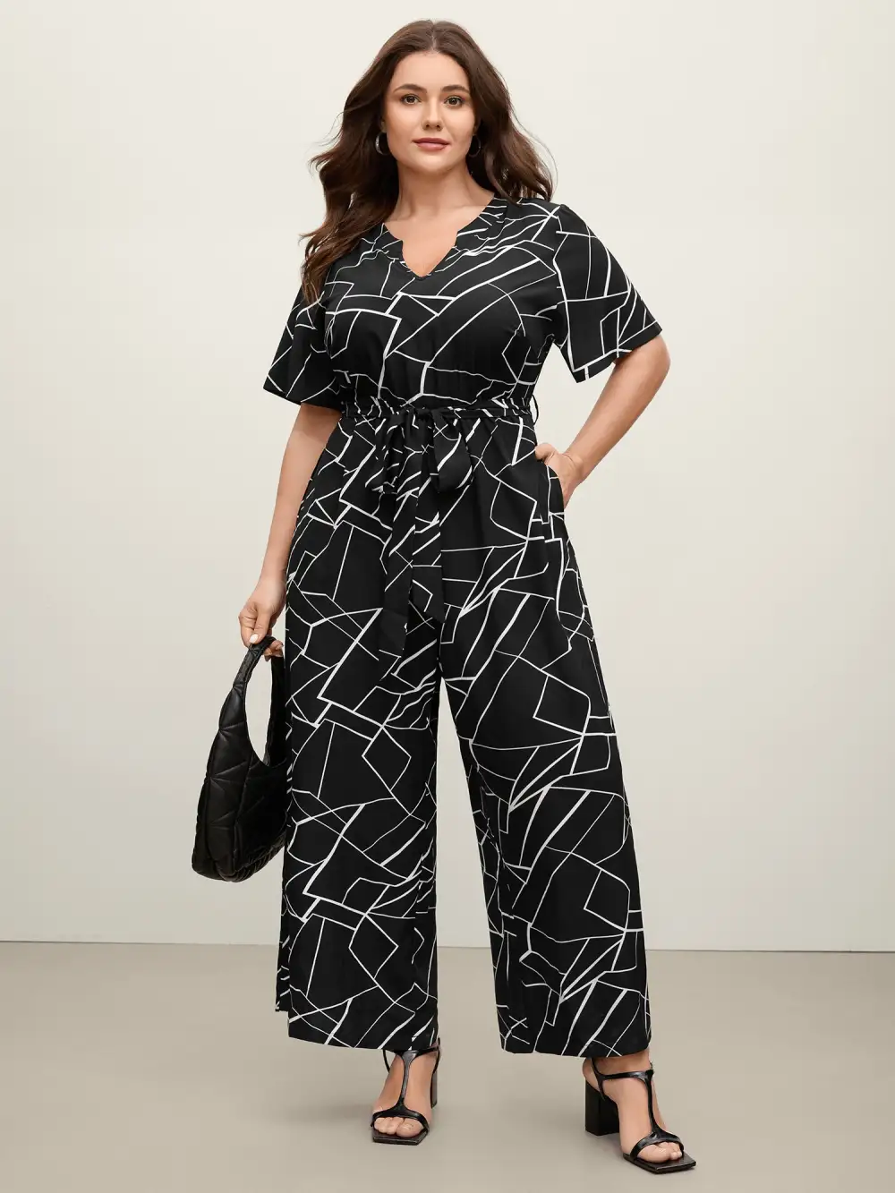 Shop Geometric Print Waist-Defining Belted Jumpsuit now and redefine your style with confidence at BloomChic. Tailored for mid and plus-size women. This trendy Jumpsuits Women, sizes 10-30. Color:Black;Neckline:Flat collar with V-notch;Prints:Stripes;Pocket:Side seam pocket;Belt:Belt;Closure Type:False placket