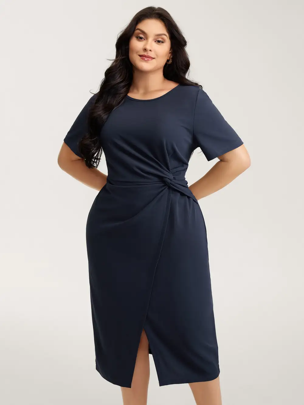 Shop Half-Sleeve Split Front Sheath Midi Dress now and redefine your style with confidence at BloomChic. Tailored for mid and plus-size women. This trendy Dress, sizes 10-30. You can never go wrong with BloomChic Dresses. Color:Midnight;Neckline:Round Neck;Sleeve Type:Ruffle Sleeve;Prints:Non;Details:Twist, Slit;Pocket:Side seam pocket;Belt:No-belt;Closure Type:Non