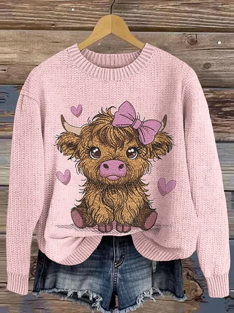 Highland Cow Love Pattern Round Neck Sweater 10891401