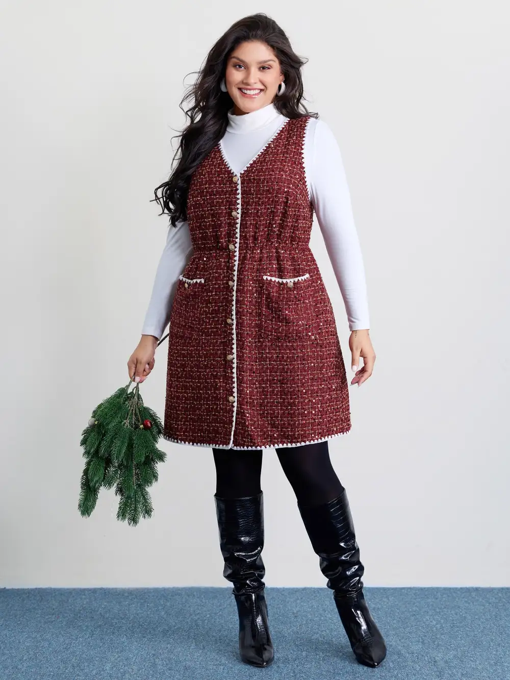Shop Holiday Tweed Contrast Edge Mini Dress now and redefine your style with confidence at BloomChic. Tailored for mid and plus-size women. This trendy Dress, sizes 10-30. You can never go wrong with BloomChic Dresses. Color:Deepred;Neckline:V-neck;Sleeve Type:Sleeveless;Prints:Plaid;Pocket:Patch pocket;Belt:No-belt;Closure Type:Non