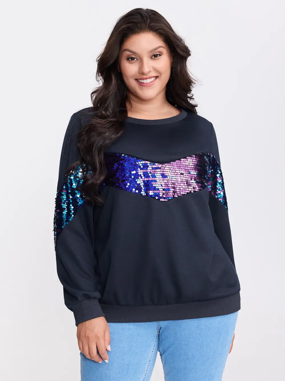 Shop Iridescent Sequin Spliced Round Neck Sweatshirt now and redefine your style with confidence at BloomChic. Tailored for mid and plus-size women. This trendy Tops Women, sizes 10-30. Color:Indigo;Neckline:Round Neck;Sleeve Type:Regular Sleeve;Prints:Synthetic texture;Pocket:No-pocket;Belt:No-belt;Closure Type:Non
