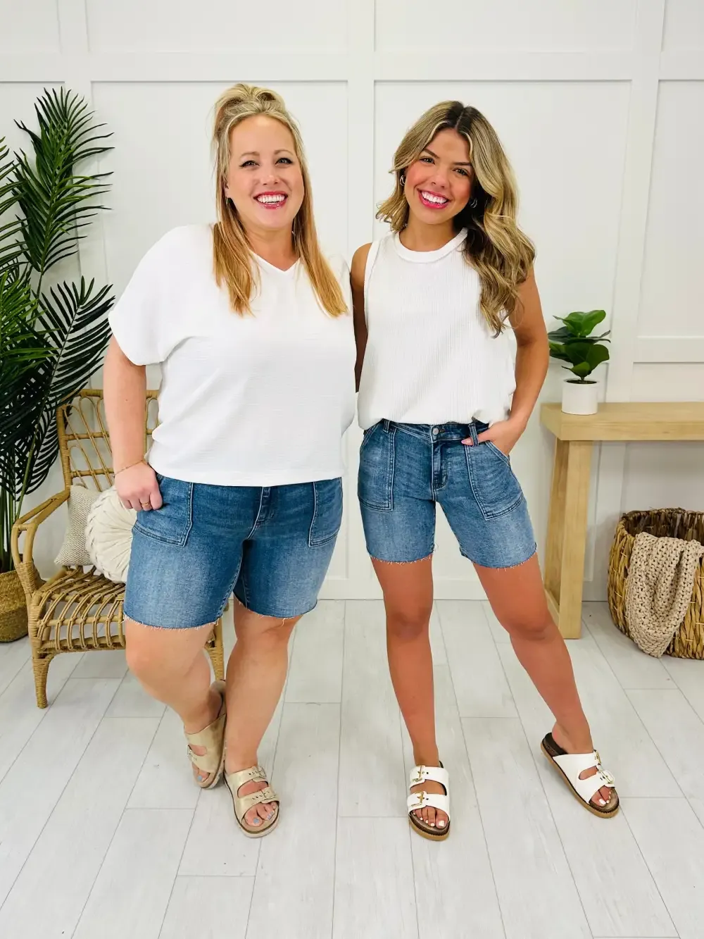 With a clean, tailored silhouette and longer inseam, these bermuda denim shorts strike the perfect balance between comfort and polish. The standout flap back pockets add a touch of utility style, while the raw edge hem keeps the look casual and modern. Designed with structure in mind, these shorts offer a flattering, stay-put fit that moves with you.