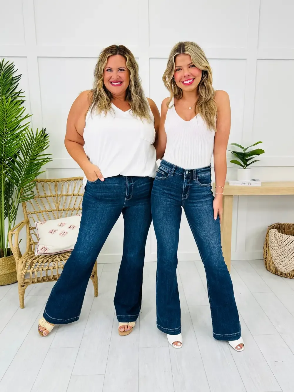 These dark wash trouser flares bring an effortlessly polished look to your wardrobe. The clean, non-distressed design pairs perfectly with anything from casual tees to dressy blouses, making them a versatile choice for any occasion. Whether you’re dressing them up for a night out or keeping it chic during the day, these flares offer the perfect balance of sophistication and comfort.