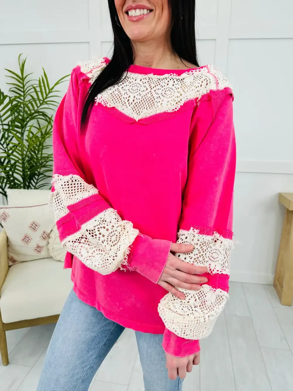 This top is a total statement piece with its vibrant mineral-washed fabric and intricate lace details!