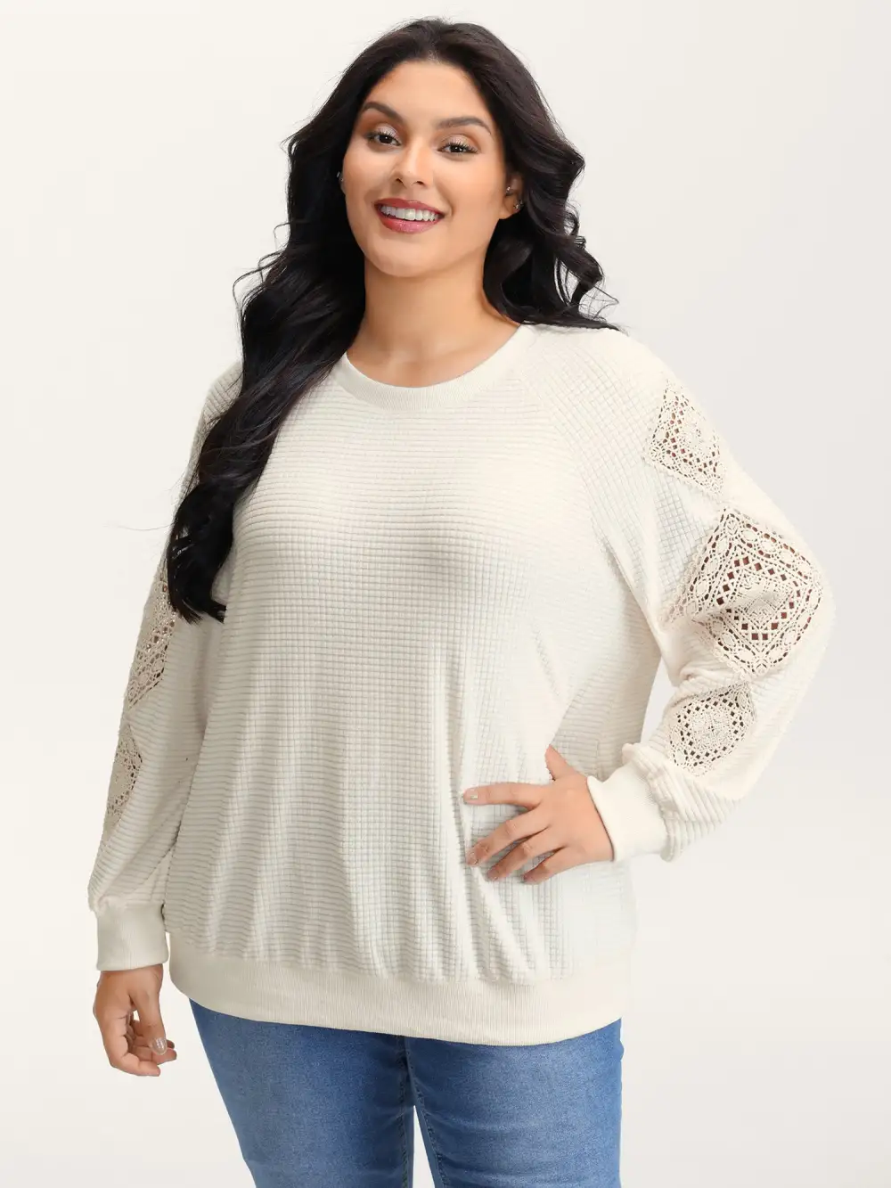 Shop Lace Textured Sheer Sleeve Sweatshirt now and redefine your style with confidence at BloomChic. Tailored for mid and plus-size women. This trendy Tops Women, sizes 10-30. Color:Beige;Neckline:Round Neck;Sleeve Type:Regular cuff;Prints:Synthetic texture;Pocket:No-pocket;Belt:No-belt;Closure Type:Non