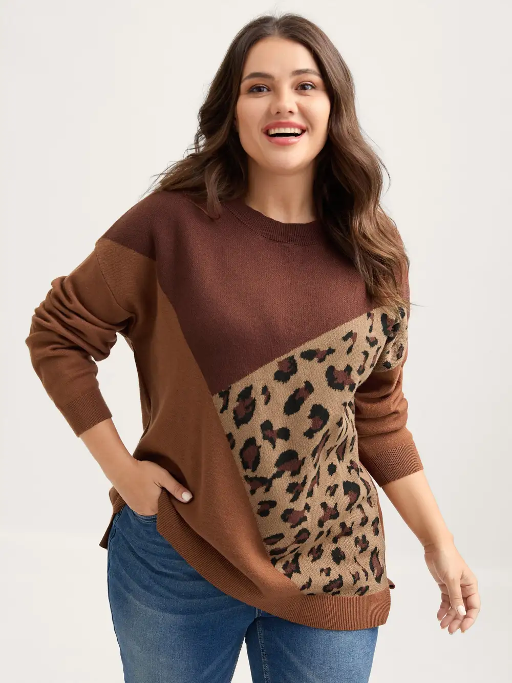 Shop Leopard Jacquard Colorblock Pullover now and redefine your style with confidence at BloomChic. Tailored for mid and plus-size women. This trendy Sweaters Cardigans Women, sizes 10-30. Color:Leopard;Neckline:Round Neck;Sleeve Type:Drop shoulder sleeve;Prints:Animal print;Details:Contrast;Pocket:No-pocket;Belt:No-belt;Closure Type:Non