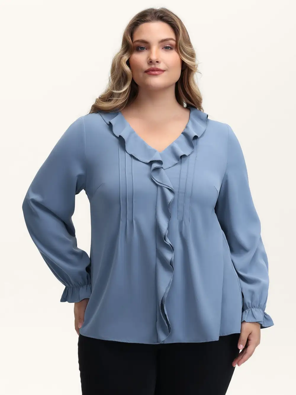 Shop Lotus Leaf Edge Toothpick Pleats Blouse now and redefine your style with confidence at BloomChic. Tailored for mid and plus-size women. This trendy Tops Women, sizes 10-30. Color:Stone;Prints:Non;Neckline:V-neck;Sleeve Type:Lantern Sleeve;Details:Ruffles, Tucked seam;Pocket:No-pocket