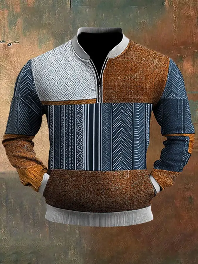 Men'S Casual 1/4 Zipper Half Stand Collar Retro Color Block Print Long Sleeve Sweatshirt 11026578