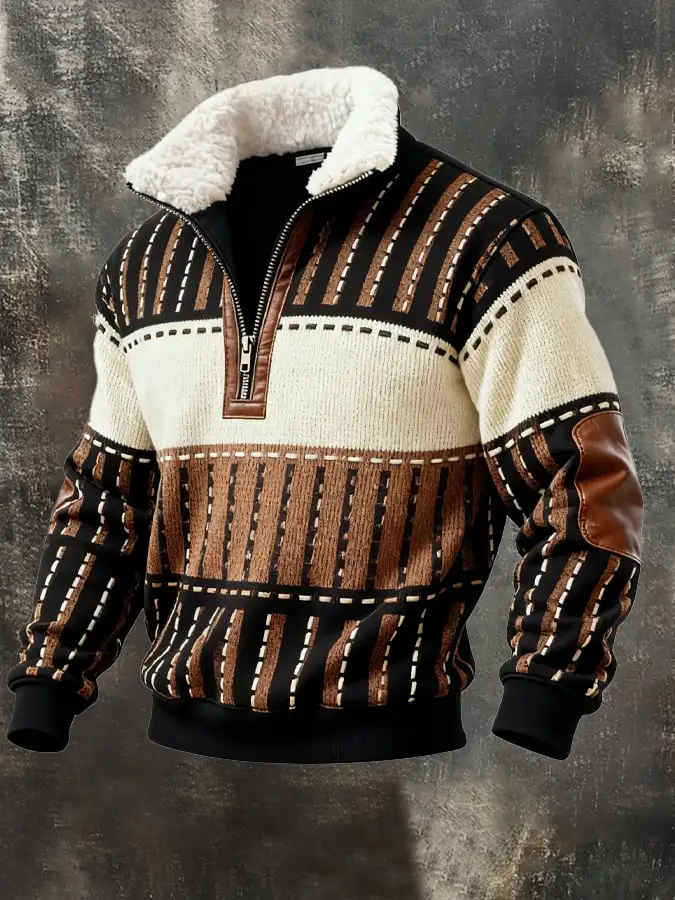 Men's Retro Color Block Print Casual Fur Collar Sweatshirt