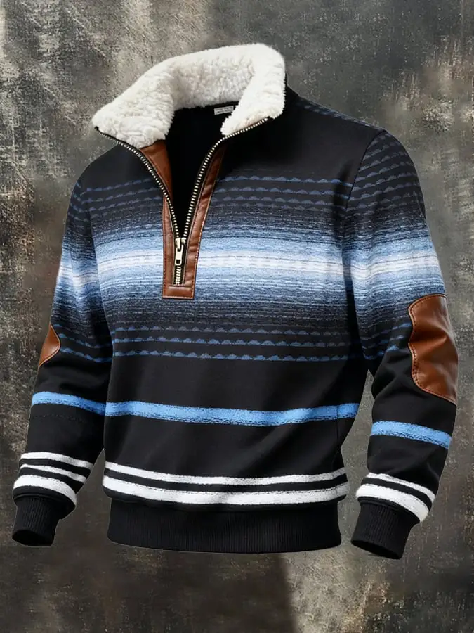 Men's Retro Color Block Print Casual Fur Collar Sweatshirt