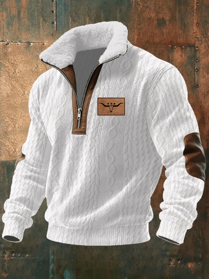 Men's Retro Cow Jacquard Fabric Zipper Fur Collar Long Sleeve Sweatshirt