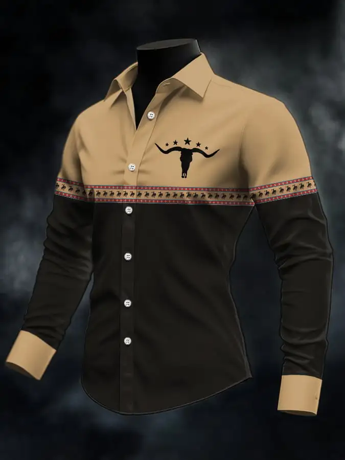 Men's Retro Western Bullhead Print Long Sleeve Shirt