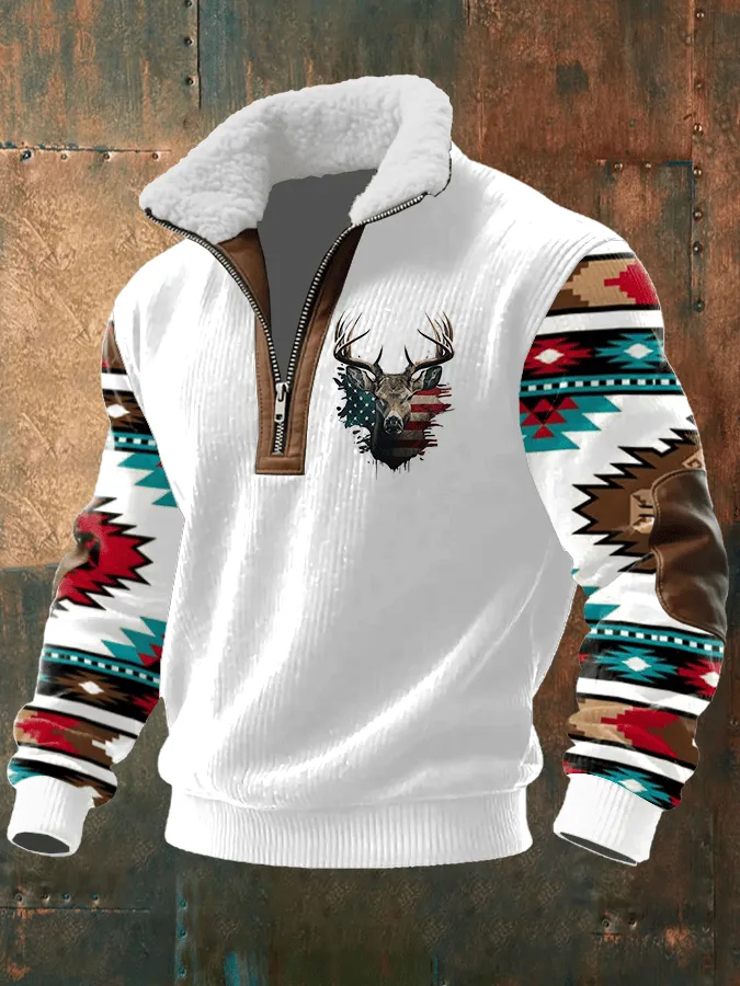 Men's Retro Western Print Knit Fabric Zipper Fur Collar Long Sleeve Sweatshirt