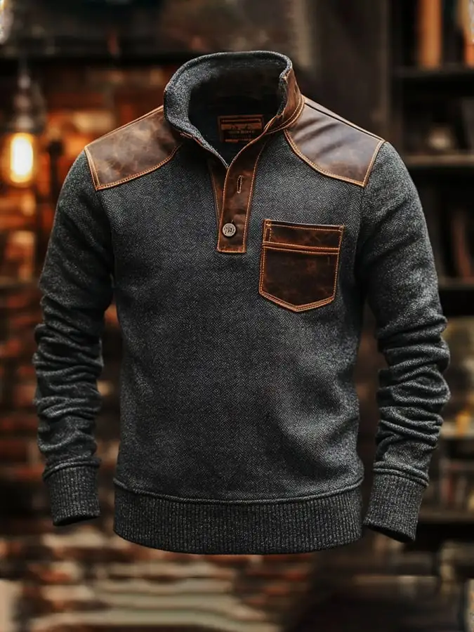 Men's Vintage Herringbone Leather Button-Down Stand Collar Long Sleeve Top