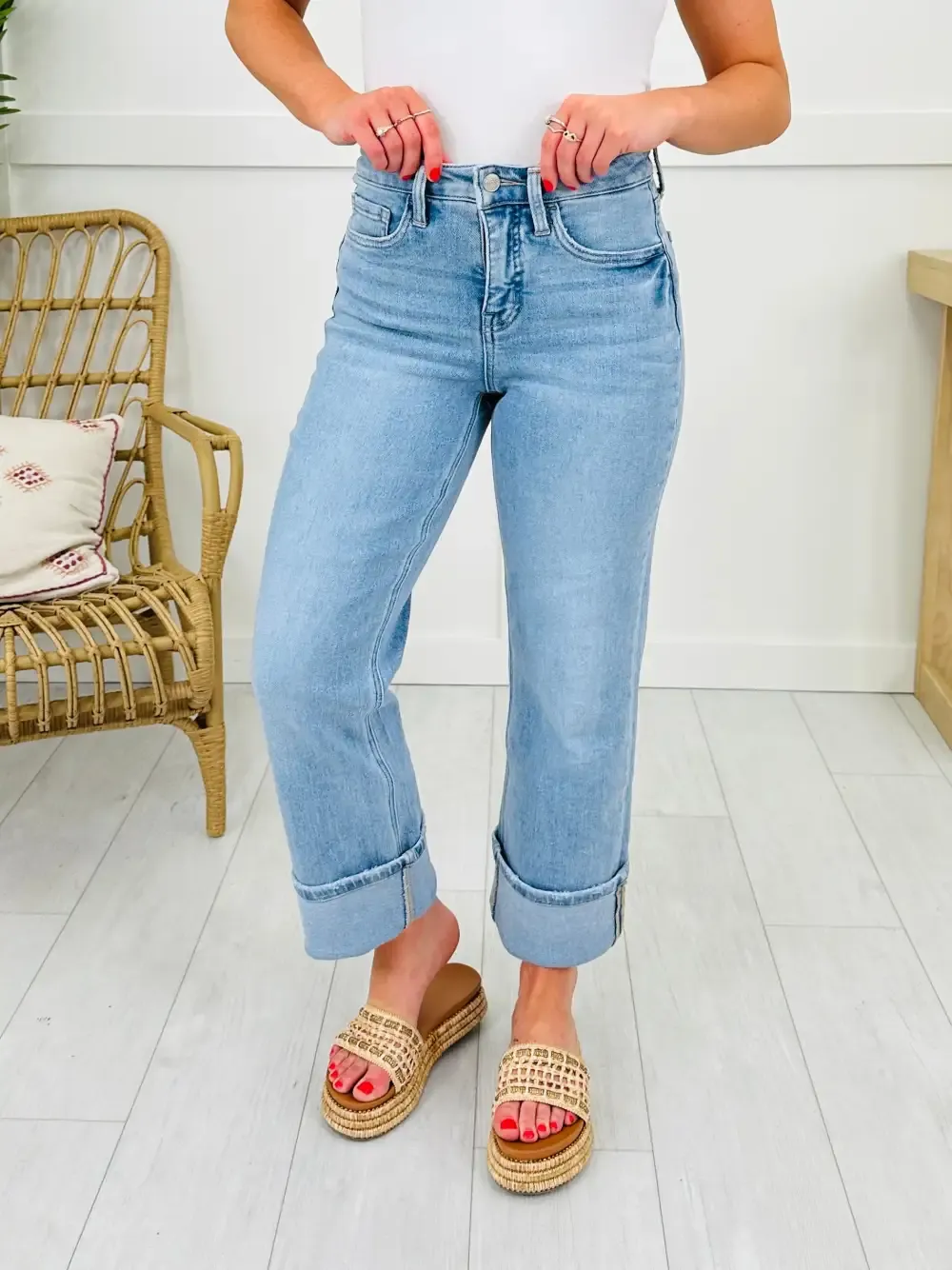 These slim wide leg jeans also feature tummy control, making them extra flattering for a confidence boost you didn't know could exist. The fabrication is buttery soft and stretchy and they hold their shape all day long. They do not stretch out as the day goes on! These jeans have zero holes or distressing so they can be worn from work to weekend to everywhere in between. The cuff is adjustable and can come uncuffed to make them longer or shorter or wear them different ways to match your outfit. The inseam will work for every woman!