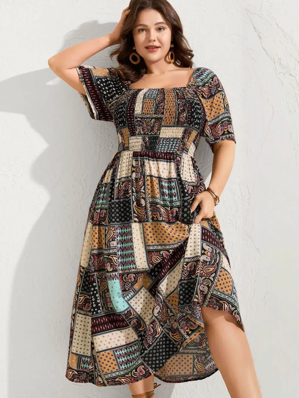 Shop Paisley Floral Collage Shirred Pockets Midi Dress now and redefine your style with confidence at BloomChic. Tailored for mid and plus-size women. This trendy Dress, sizes 10-30. You can never go wrong with BloomChic Dresses. Color:Black;Neckline:Square Neck;Sleeve Type:Ruffle Sleeve;Prints:Paisley;Pocket:Side seam pocket;Belt:No-belt;Closure Type:Non