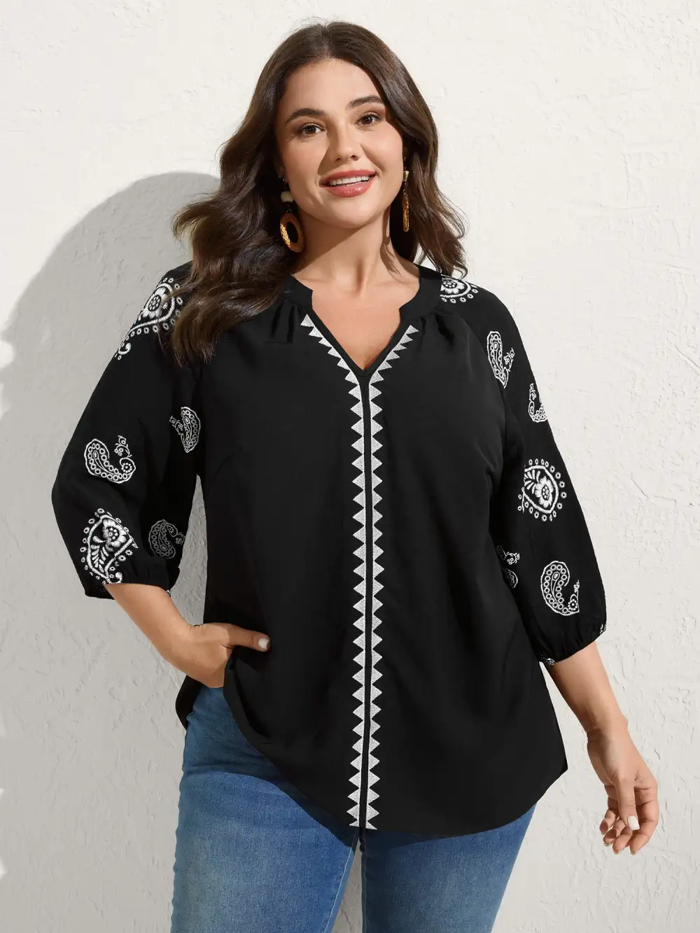 Shop Paisley Embroidered Sleeve Spliced Blouse now and redefine your style with confidence at BloomChic. Tailored for mid and plus-size women. This trendy Tops Women, sizes 10-30. Color:Black;Prints:Non;Neckline:Flat collar with V-notch;Sleeve Type:Lantern Sleeve;Details:Embroidered, Gathered;Pocket:No-pocket