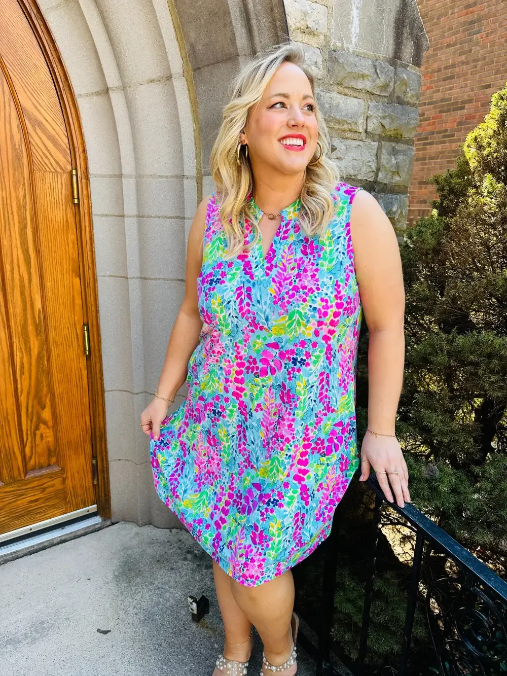 Featuring a vibrant watercolor-inspired floral print, a notched V-neckline, and a relaxed silhouette, this dress is designed for all-day comfort with a playful touch. Lightweight and easy to wear, this flowy piece is perfect for keeping things bright and stylish!