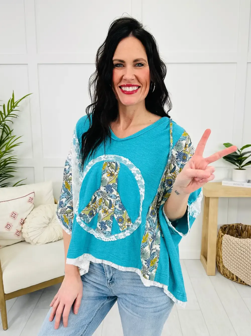 Designed with a relaxed, flowy fit, this unique piece features a floral patchwork peace sign, playful contrasting sleeves, and delicate lace trim for the perfect mix of edgy and feminine. The textured fabric adds a cozy touch, making it as comfortable as it is cute.