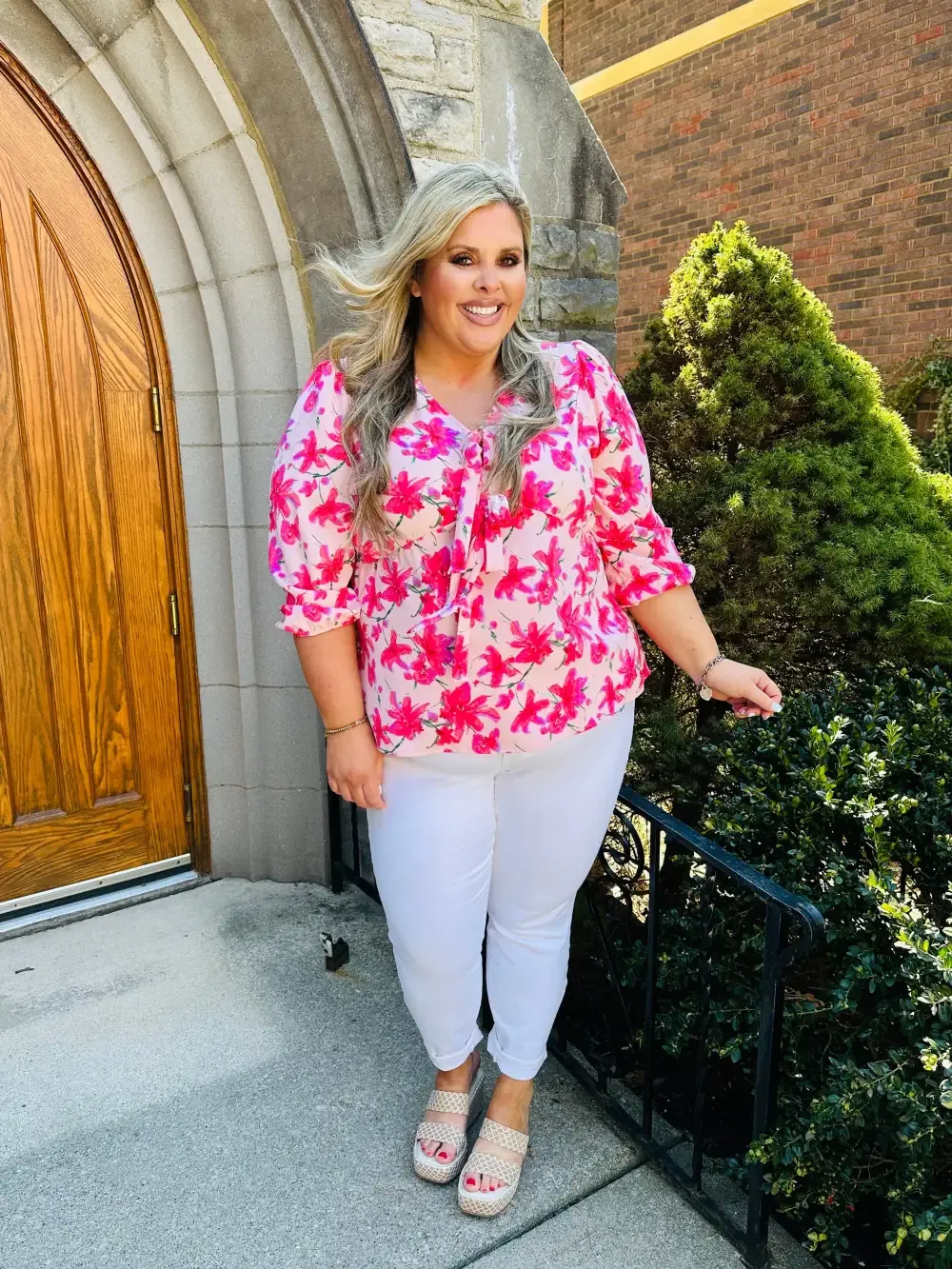 Designed with a flattering V-neckline, a dainty front tie, and a flowy peplum shape, this top brings the perfect mix of charm and confidence. Billowy sleeves with elastic cuffs add a touch of elegance, making this the perfect top to dress up or down!