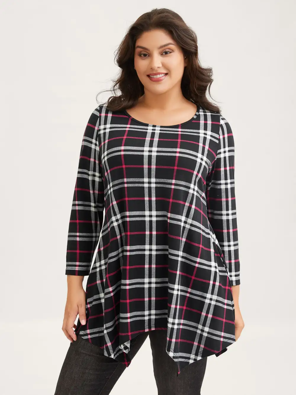 Shop Plaid Asymmetrical Hem Pocket T-shirt now and redefine your style with confidence at BloomChic. Tailored for mid and plus-size women. This trendy Tops Women, sizes 10-30. Color:Black;Style:Casual;Prints:Plaid;Neckline:Round Neck;Sleeve Type:Regular Sleeve;Details:Asymmetrical;Pocket:Side seam pocket