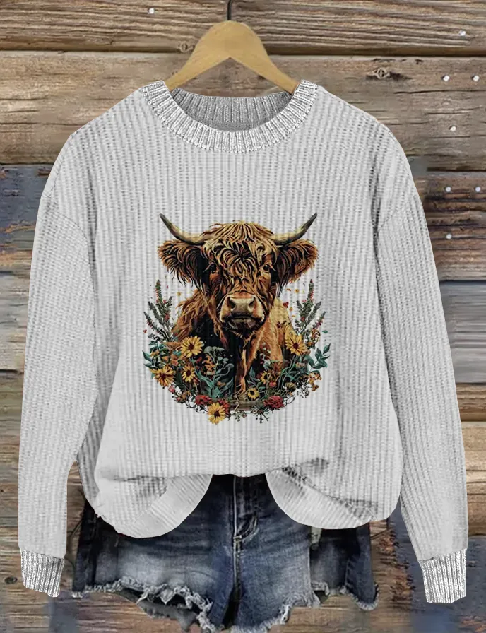 Plant and Flower Art Highland Cow Round Neck Sweater